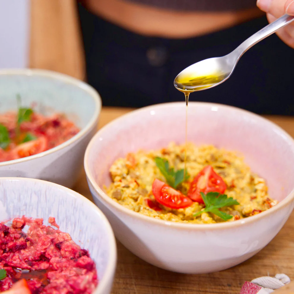 Unser Probierpaket bringt dir Vielfalt auf den Löffel: Mit Tomate-Linse, Curry-Linse und Rote Bete-Kartoffel erwarten dich drei vollwertige Bio-Gerichte mit ganz eigenem Charakter. Alle sind 100 % vegan, proteinreich und in nur fünf Minuten fertig – aber geschmacklich weit entfernt von „schnell gemacht“.